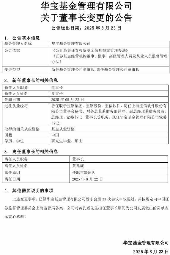 8月23日,华宝基金发布公告,原董事长黄孔威因“任职年龄原因”离任,由来自股东方宝武集团体系、原宝信软件董事长的夏雪松接任。